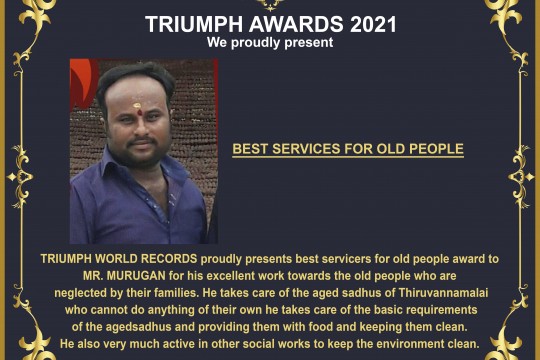 TRIUMPH AWARDS 2021 Presents BEST SERVICES FOR OLD PEOPLE to MR. MURUGAN