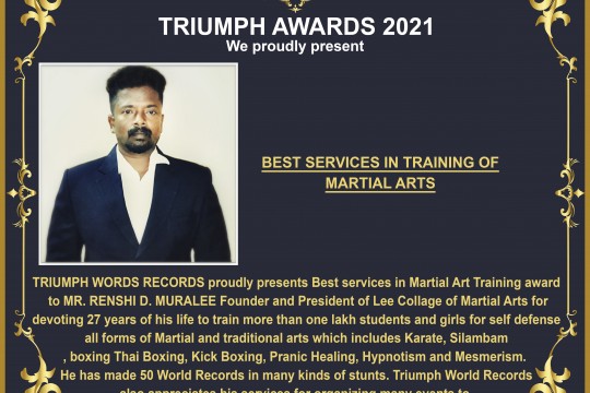 TRIUMPH AWARDS 2021 Presents BEST SERVICES IN TRAINING OF MARTIAL ARTS to MR. D. MURALEE DHIL DHIL.