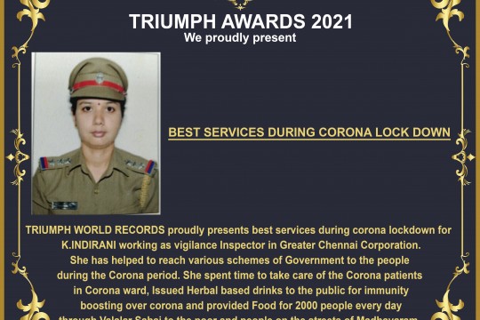 TRIUMPH AWARDS 2021 Presents BEST SERVICES DURING CORONA LOCK DOWN to MRS. INDIRANI. VIGILANCE INSPECTOR.